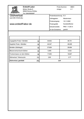 Das Protokoll zur Bestimmung des Glühverlustes enthält die Ergebnisse aller Wägungen. Das Versuchsergebnis wird als Glühverlust in % angegeben.